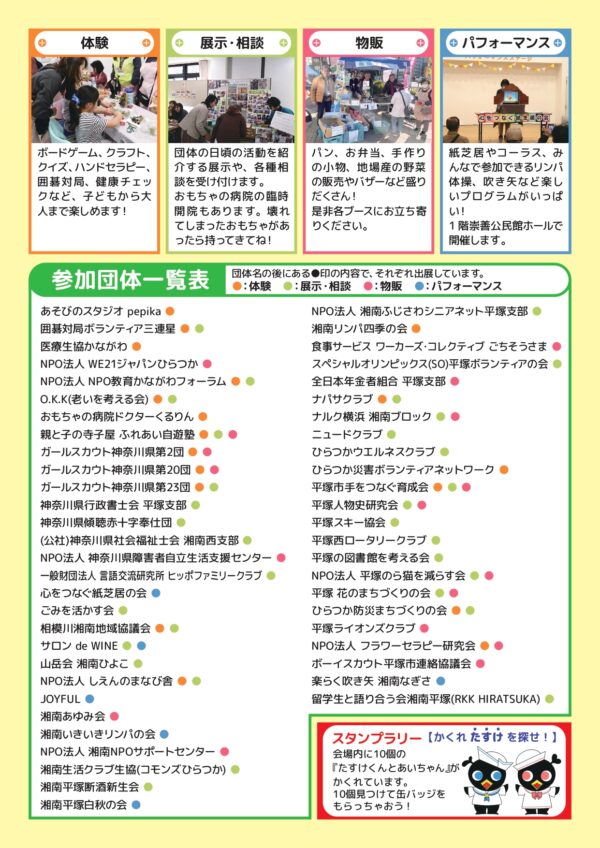 お問合せ:ひらつか市民活動センター 平塚市見附町1-8 崇善公民館2階