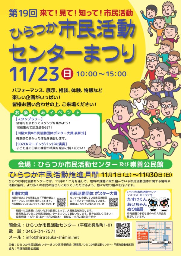 お問合せ:ひらつか市民活動センター 平塚市見附町1-8 崇善公民館2階