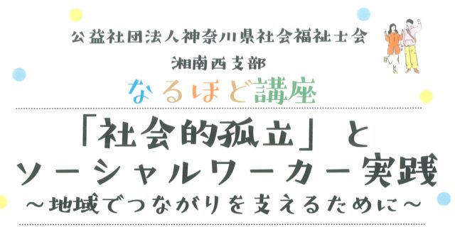 湘南西支部主催 市民向け公開講座「なるほど講座」 「社会的孤立」とソーシャルワーカーの役割 ▼日時 2月14日(土) 13:30~15:30 ▼会場 ひらつか市民活動センター ▼参加費 無料 ...