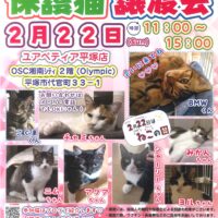 ▼日時 2月22日(日) 11:00~15:00 ▼場所 ユアペティア平塚店(OSC湘南シティ2F) 平塚のら猫を減らす会 ※参加猫はブログで紹介します ※譲渡の際、ワクチン・医療費などのご負担をお願いして […]