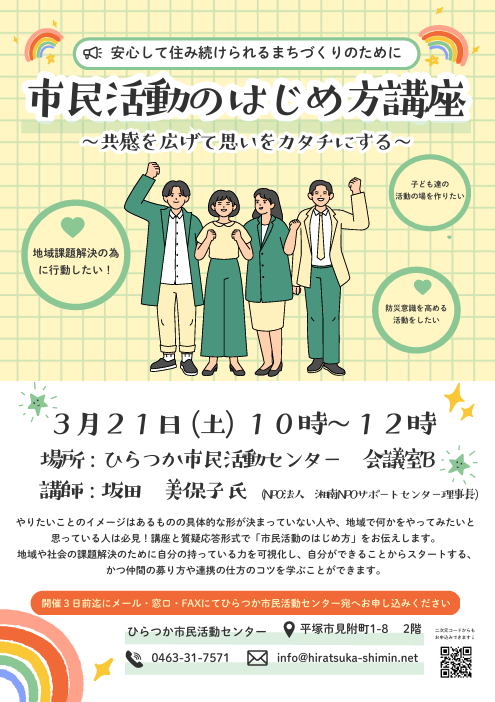 お問合せ:ひらつか市民活動センター  平塚市見附町1-8 崇善公民館2階