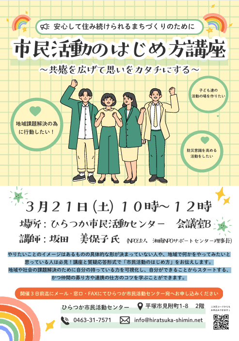 お問合せ:ひらつか市民活動センター 平塚市見附町1-8 崇善公民館2階